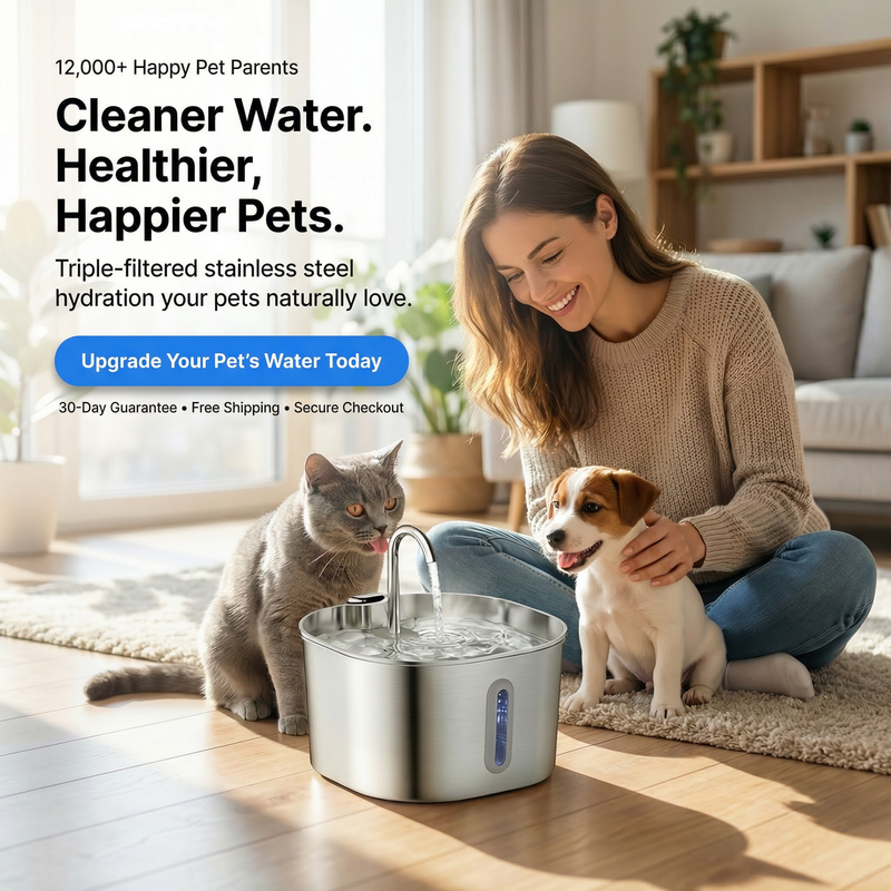 A stainless steel pet water fountain with triple-layer filtration for cleaner, flowing hydration.